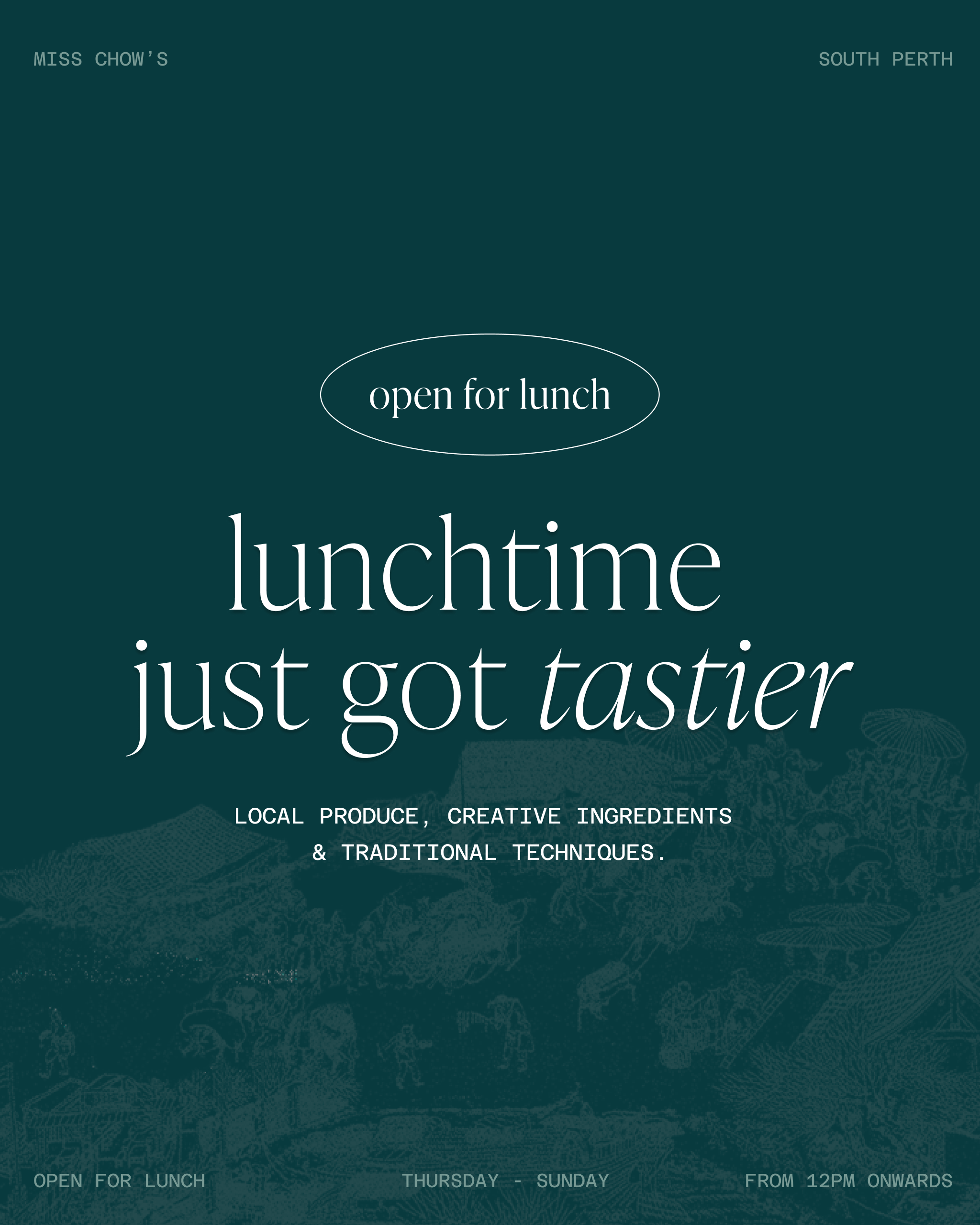 Strategic brand management and creative direction for Miss Chow’s, Moon & Mary, Lucy Luu’s, and Lena’s Bar venues in Perth.